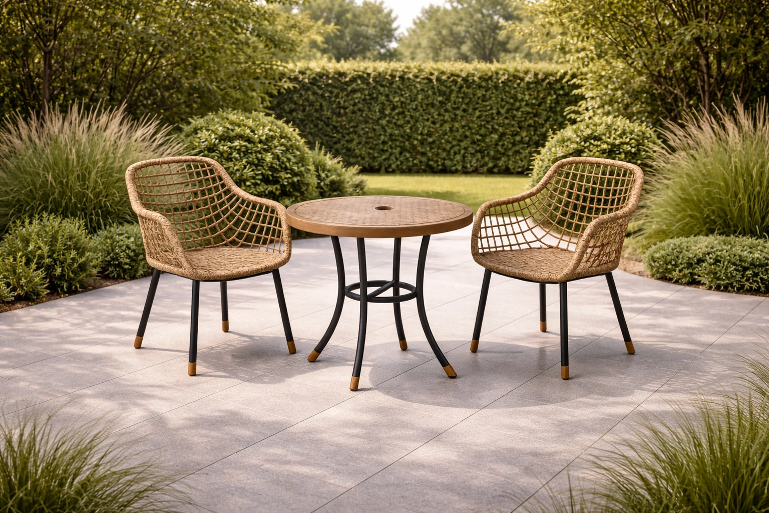 Ensemble table et chaises de jardin en rotin marron et noir avec table ronde et deux chaises