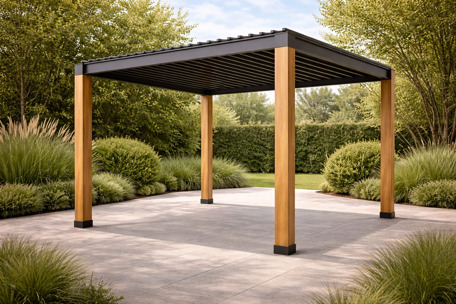 Pergola en aluminium avec pieds effet bois et toit à lames orientables