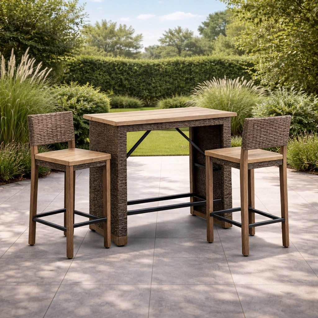 Ensemble table bar avec tabourets en aluminium et résine tressée