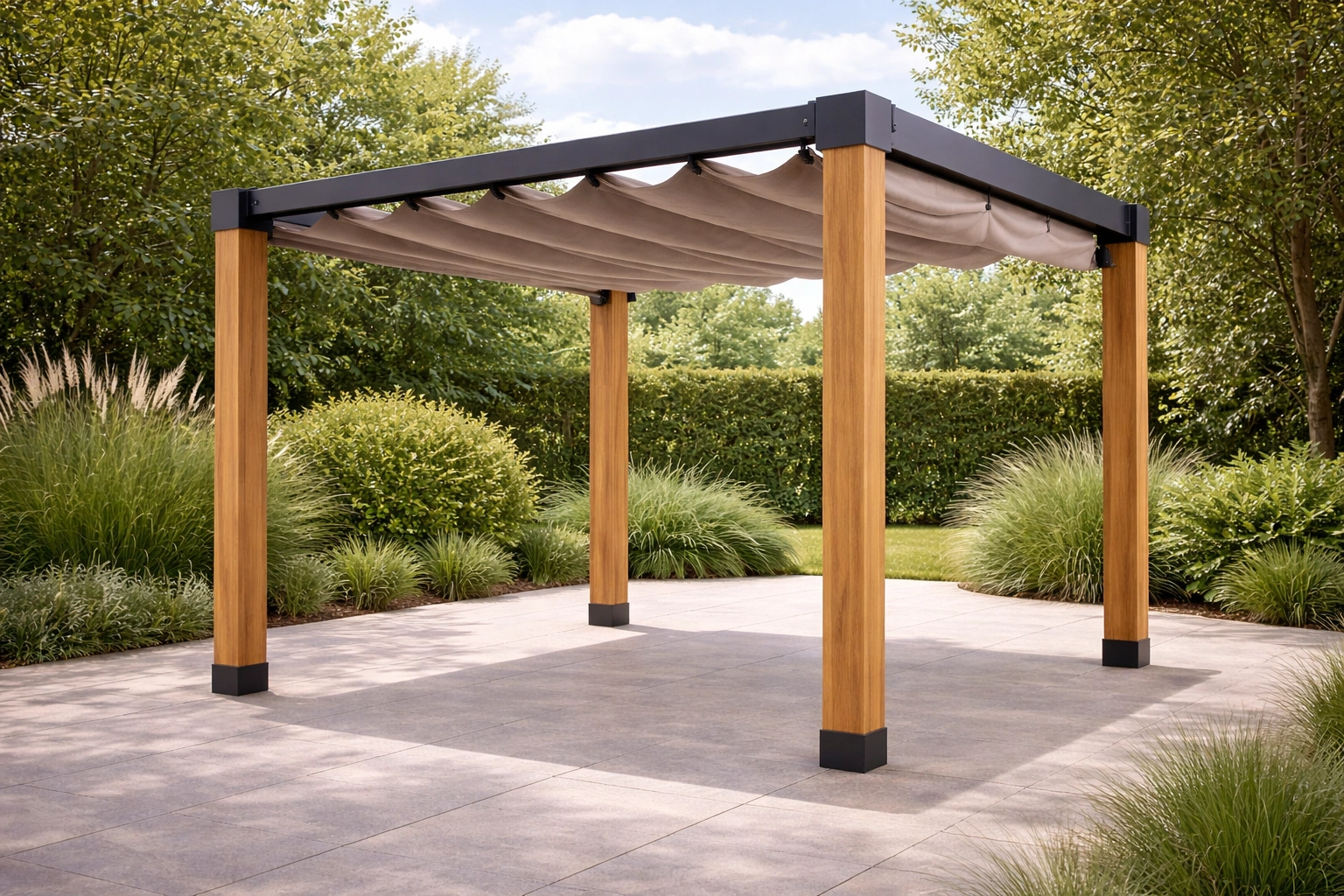 Pergola en aluminium et bois d'acacia avec toile en polyester beige