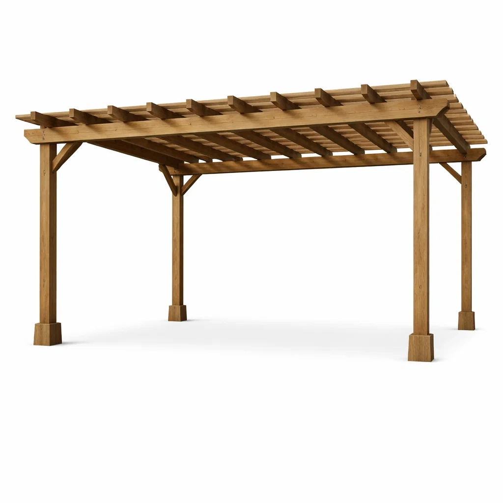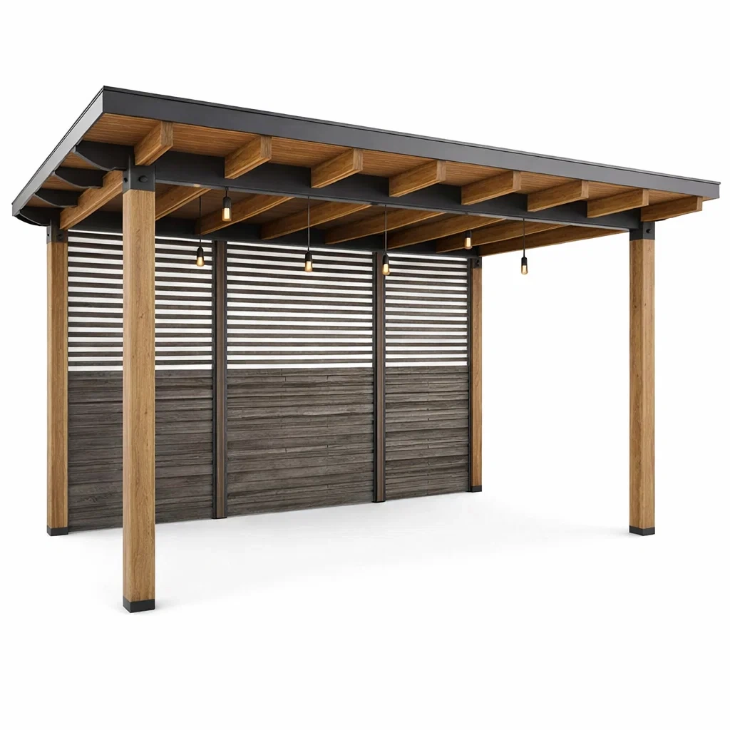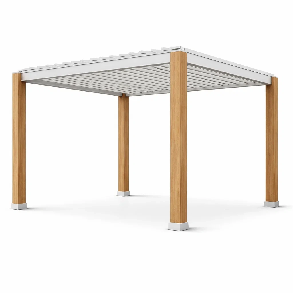 Pergola en aluminium avec pieds effet bois et toit à lames orientables