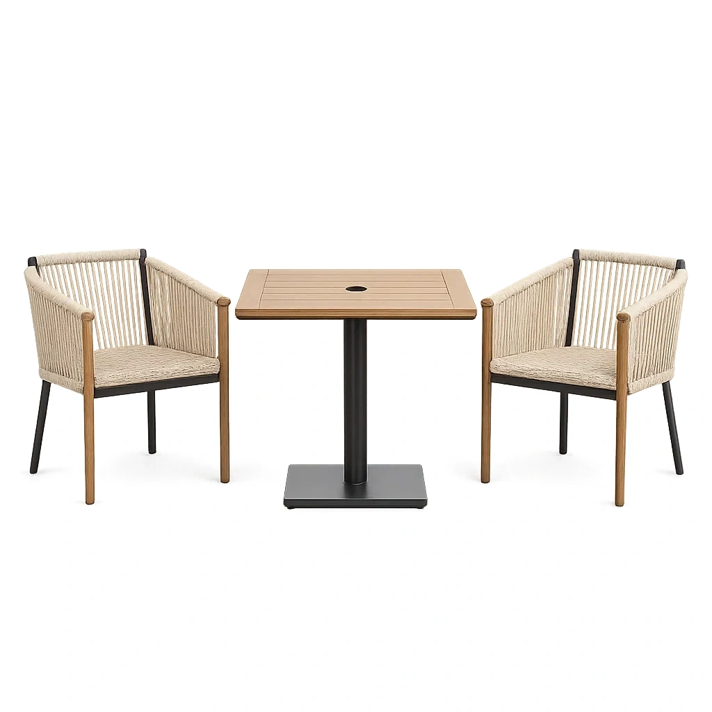 Chaises avec cadre en aluminium et assise en corde tissée.