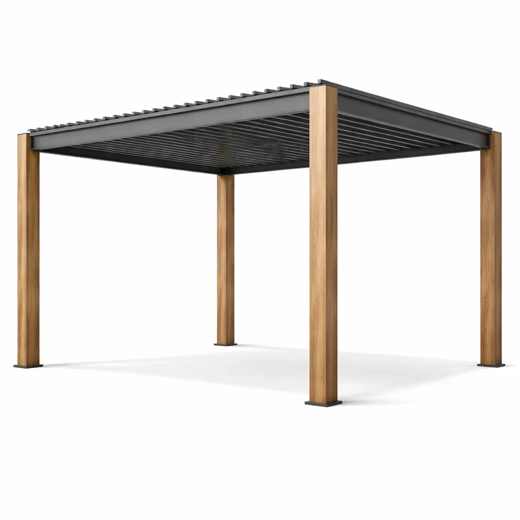 Cette pergola moderne en aluminium est conçue pour l'extérieur, offrant une protection contre le soleil et la pluie. Pieds avec revêtement effet bois.
