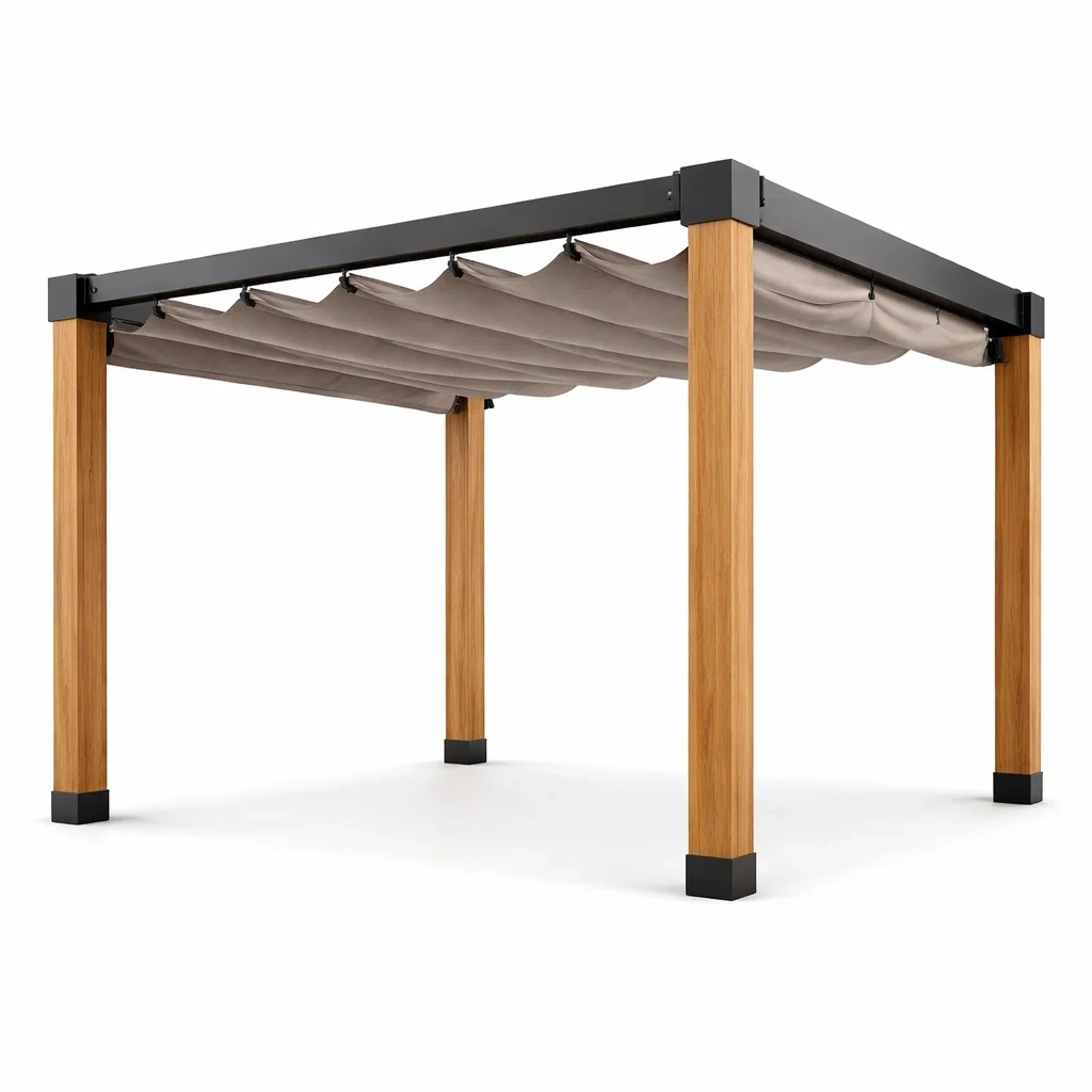 Pergola en aluminium et bois d'acacia avec toile en polyester beige